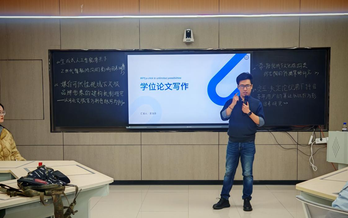本网讯(通讯员:李垚娇、王曼燚、邓玉果)2025年10月20日晚,长春工业大学新闻与传播学院特邀东北师范大学吴浩辰博士在我院信息楼209智慧教室举行了一场关于学位论文写作经验的分享报告会,同院杜新宁博士作为协同嘉宾,助力学生应对论文各环节难题,降低校外盲审、抽查等环节的风险,让学生顺利地完成论文与答辩。